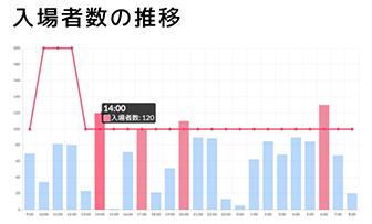 1時間毎の入場者数をグラフで表示可能。密になりやすい時間帯が視覚的にわかります。
